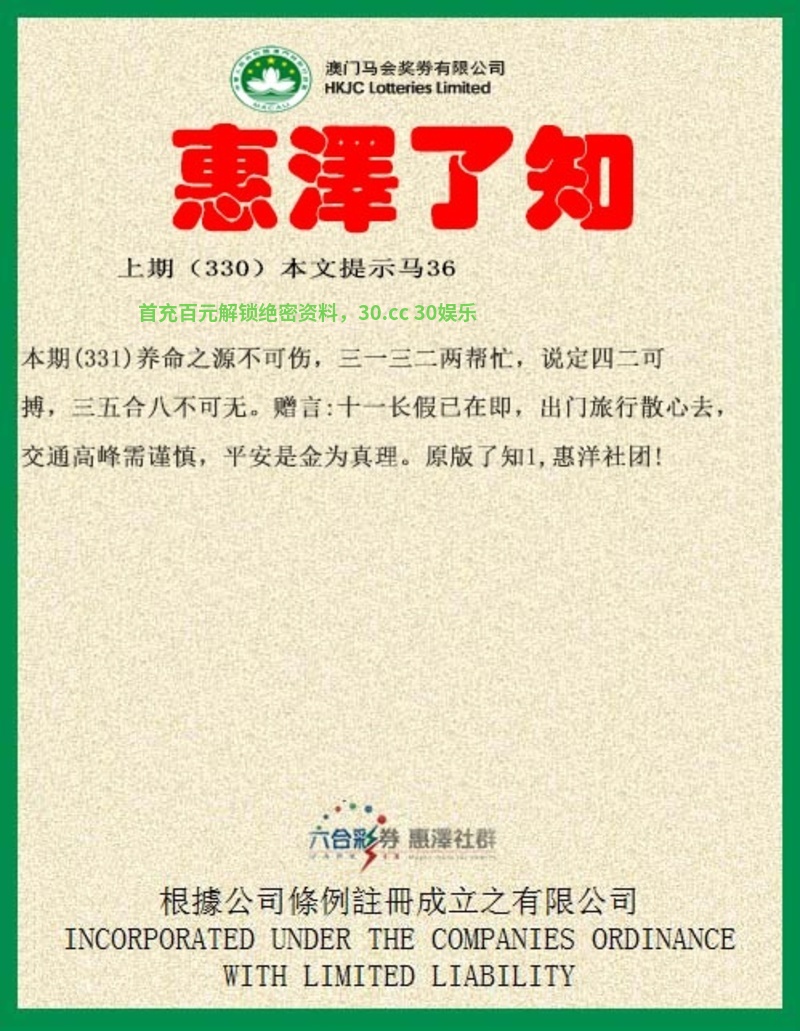 【惠泽了知】331期:养命之源不可伤,三一三二两帮忙,说定四二可搏,三五合八不可无。赠言:十一长假已在即,出门旅行散心去,交通高峰需谨慎,平安是金为真理。原版了知1,惠洋社团!